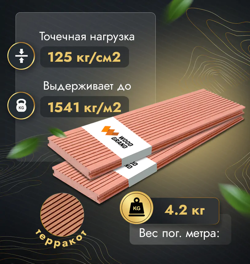 Наша террасная доска из МПК выдерживает до 3318 кг/м2, влагостойкая, не требует ухода.
